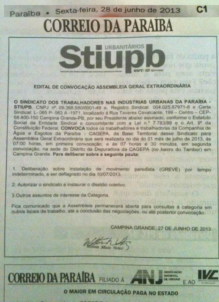 O SINDICATO DOS TRABALHADORES NAS INDÚSTRIAS URBANAS DA PARAÍBA - STIUPB, CNPJ nº 09.368.580/0001-49 e, Registro Sindical: 004.025.87971-8 e Carta Sindical: L- 065 P- 063 A -1971, localizado à Rua Tavares Cavalcante, 199 – Centro – CEP- 58.400-150 Campina Grande-PB, por seu Presidente abaixo assinado, conforme o Estatuto Social da Entidade Sindical e concomitante com a Lei n.º 7.783/89 e o Art. 9º da Constituição Federal, CONVOCA todos os trabalhadores e trabalhadoras da Companhia de Água e Esgotos da Paraíba - CAGEPA, da Base Territorial desse Sindicato para Assembléia Geral Extraordinária que será realizada no dia do 01 mês de julho de 2013, às 07:00 horas, em primeira convocação, e às 07 horas e 30 minutos, em segunda convocação, na sede do Distrito da Depuradora da CAGEPA(no bairro do Tambor) em Campina Grande.
